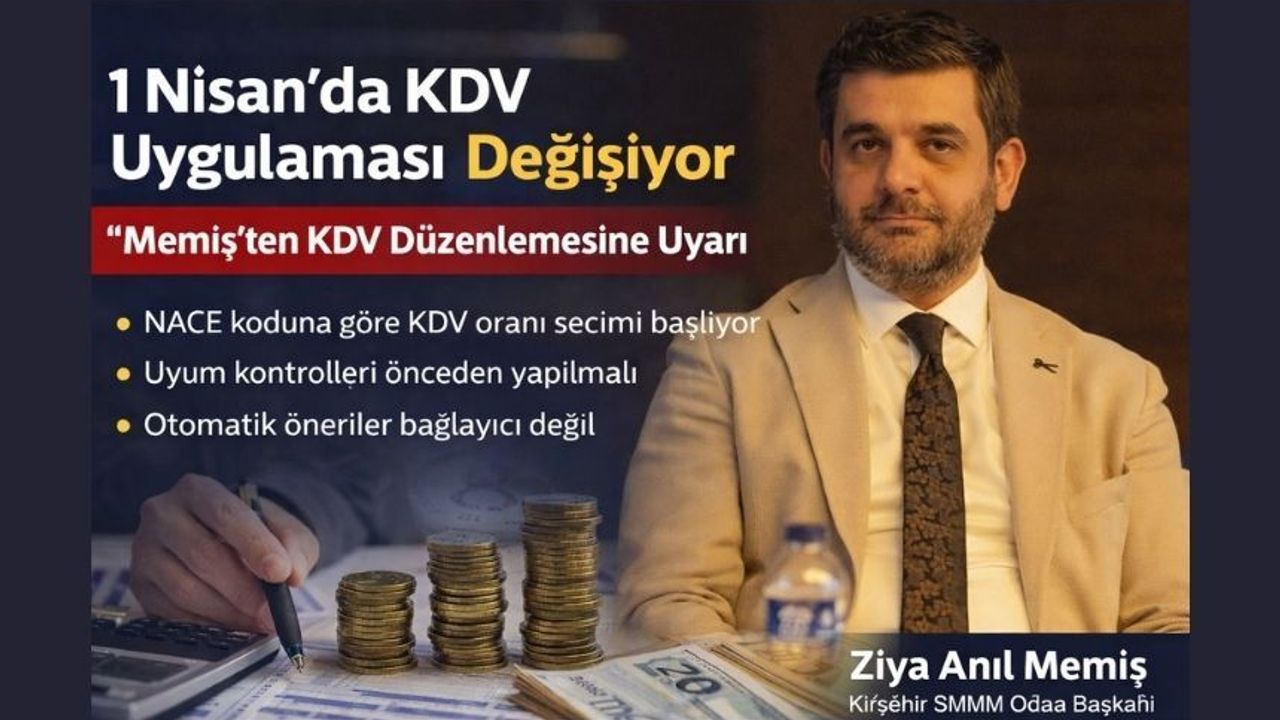 Kırşehir SMMM Odası Yönetim Kurulu Başkanı Ziya Anıl Memiş, 1 Nisan itibarıyla yürürlüğe girecek olan NACE koduna göre faturalarda KDV oranı seçimi uygulaması hakkında açıklamalarda bulundu. Memiş, yeni düzenlemenin vergi sisteminde dijitalleşme ve standartlaşma sürecinin bir parçası olduğunu ifade etti.