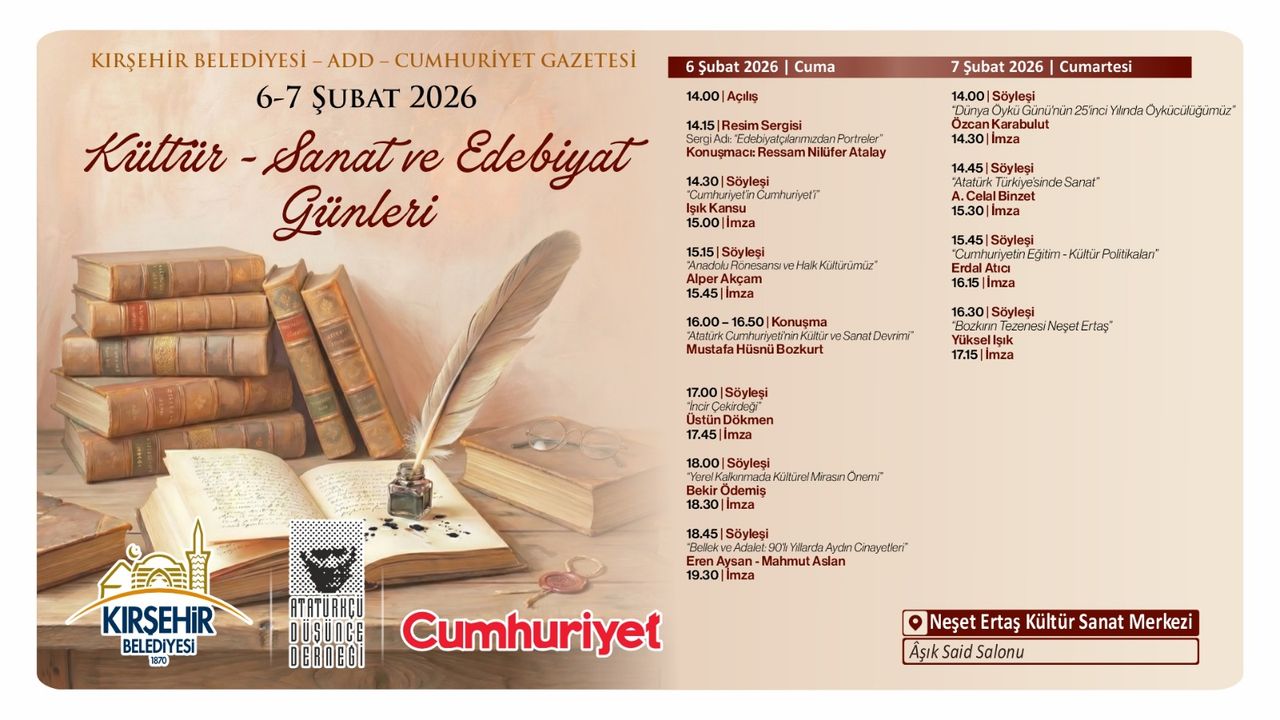 Kırşehir Belediyesi, Atatürkçü Düşünce Derneği (ADD) ve Cumhuriyet Gazetesi iş birliğiyle düzenlenecek Kültür-Sanat ve Edebiyat Günleri, 6-7 Şubat 2026 tarihlerinde Kırşehir’de sanat ve edebiyat dünyasının önemli isimlerini bir araya getirecek. Etkinlikler, Neşet Ertaş Kültür Sanat Merkezi Âşık Said Salonu’nda gerçekleştirilecek.