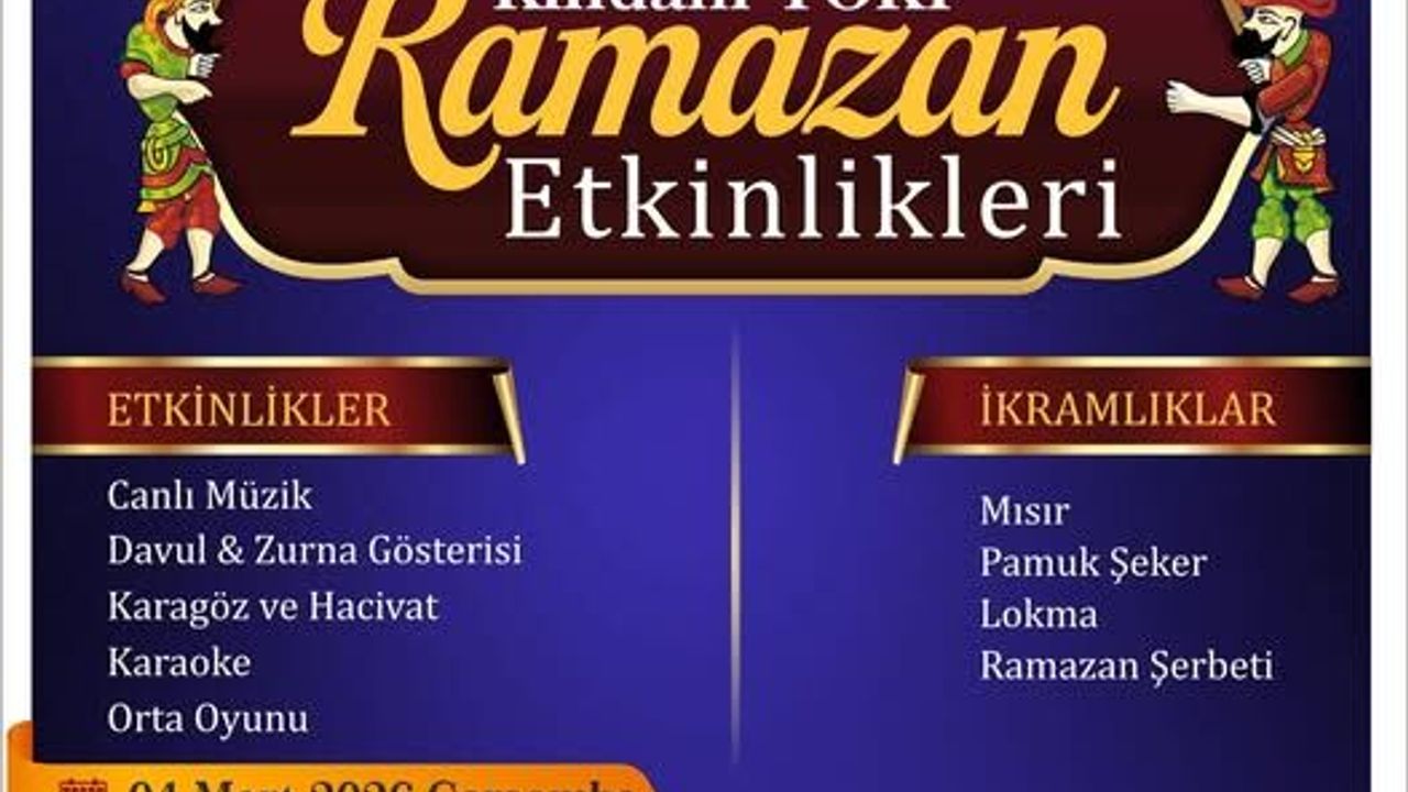 04 Mart 2026 Çarşamba günü saat 20.30’da başlayacak olan Kındam TOKİ Ramazan Etkinlikleri, 2. Etap Sosyal Tesisler’de gerçekleştirilecek. Ramazan ayı dolayısıyla düzenlenen programda, etkinlikler ve ikramlarla katılımcıların bir araya gelmesi hedefleniyor.
