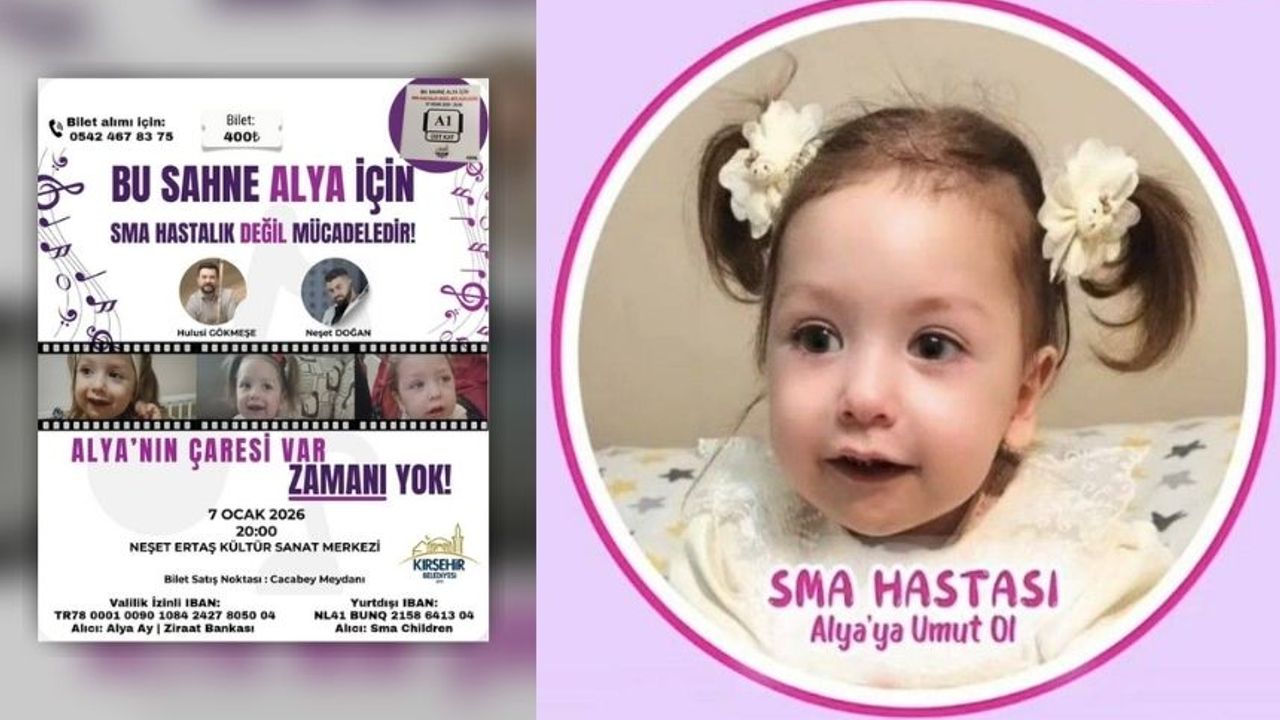 Kırşehir’de SMA hastalığıyla mücadele eden Alya Ay için, Kırşehir Belediyesi ile Alya Ay’ın ailesi tarafından organize edilen anlamlı bir dayanışma gecesi düzenleniyor. “Bu Sahne Alya İçin, SMA Hastalık Değil Mücadeledir” sloganıyla gerçekleştirilecek etkinlik, 7 Ocak 2026 Çarşamba günü saat 20.00’de, Neşet Ertaş Kültür Sanat Merkezinde yapılacak. SMA ile mücadelede farkındalık oluşturmak ve Alya Ay’ın tedavi sürecine katkı sağlamak amacıyla düzenlenen etkinlikte, sanatçılar sahne alarak destek verecek. Kırşehir’de düzenlenecek bu özel gecede, sanatçılar Hulusi Gökmeşe ve Neşet Doğan sahne alacak. Programdan elde edilecek gelir, SMA hastalığıyla mücadele eden Alya Ay’ın tedavi sürecine destek olmak amacıyla kullanılacak. Etkinlik, hem bir yardım gecesi hem de toplumsal farkındalık organizasyonu olarak dikkat çekiyor.