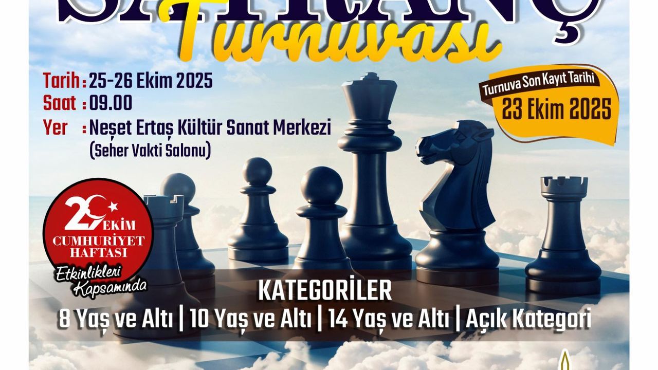 Kırşehir’de Cumhuriyet Bayramı coşkusu satranç tahtasına taşınıyor. 29 Ekim Cumhuriyet Bayramı Satranç Turnuvası, 25-26 Ekim 2025 tarihlerinde Neşet Ertaş Kültür Sanat Merkezi Seher Vakti Salonu’nda yapılacak.