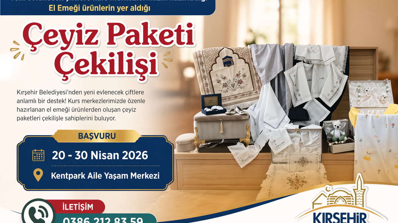 Kırşehir Belediyesi, yeni evlenecek çiftlere yönelik önemli bir destek programını hayata geçiriyor. Belediye tarafından yapılan duyuruya göre, kurs merkezlerinde hazırlanan el emeği ürünlerin yer aldığı çeyiz paketi çekilişi düzenlenecek.