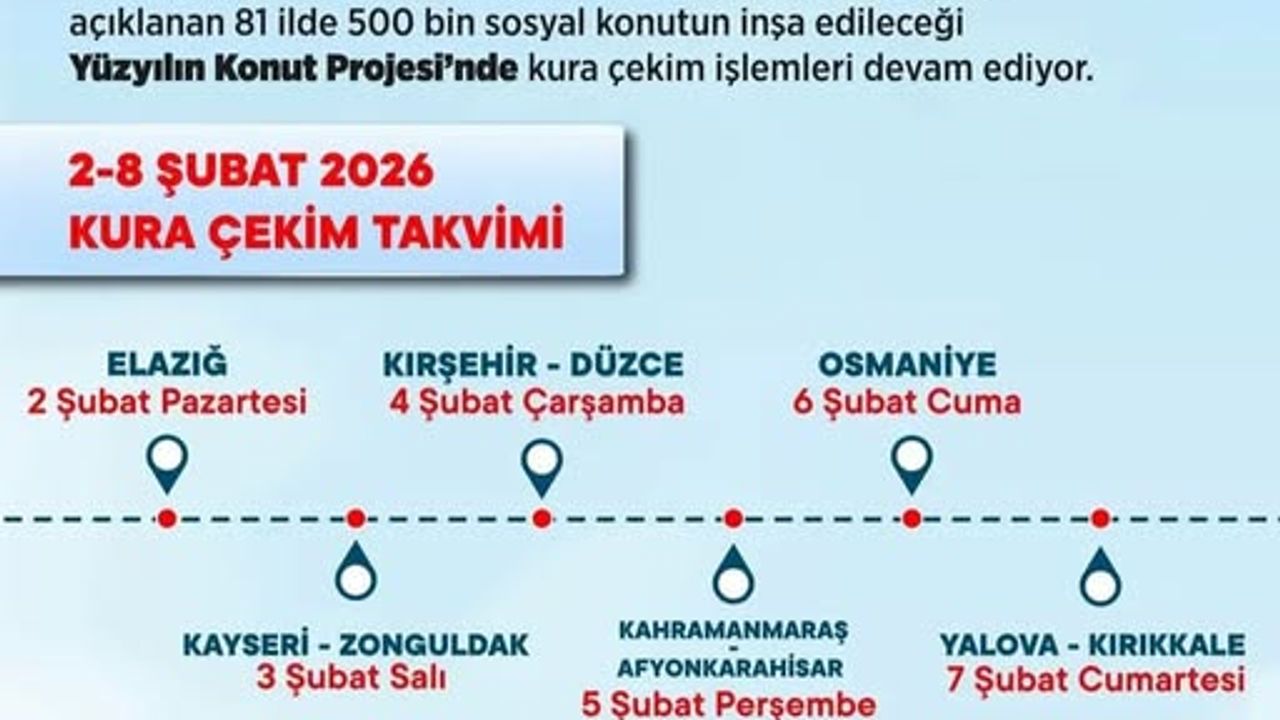 Takvimin devamında, 5 Şubat 2026 Perşembe günü Kahramanmaraş ve Afyonkarahisar’da, 6 Şubat 2026 Cuma günü Osmaniye’de, 7 Şubat 2026 Cumartesi günü ise Yalova ve Kırıkkale’de kura çekimleri gerçekleştirilecek. Böylece kura süreci, 2-8 Şubat 2026 tarihleri arasında tamamlanmış olacak.