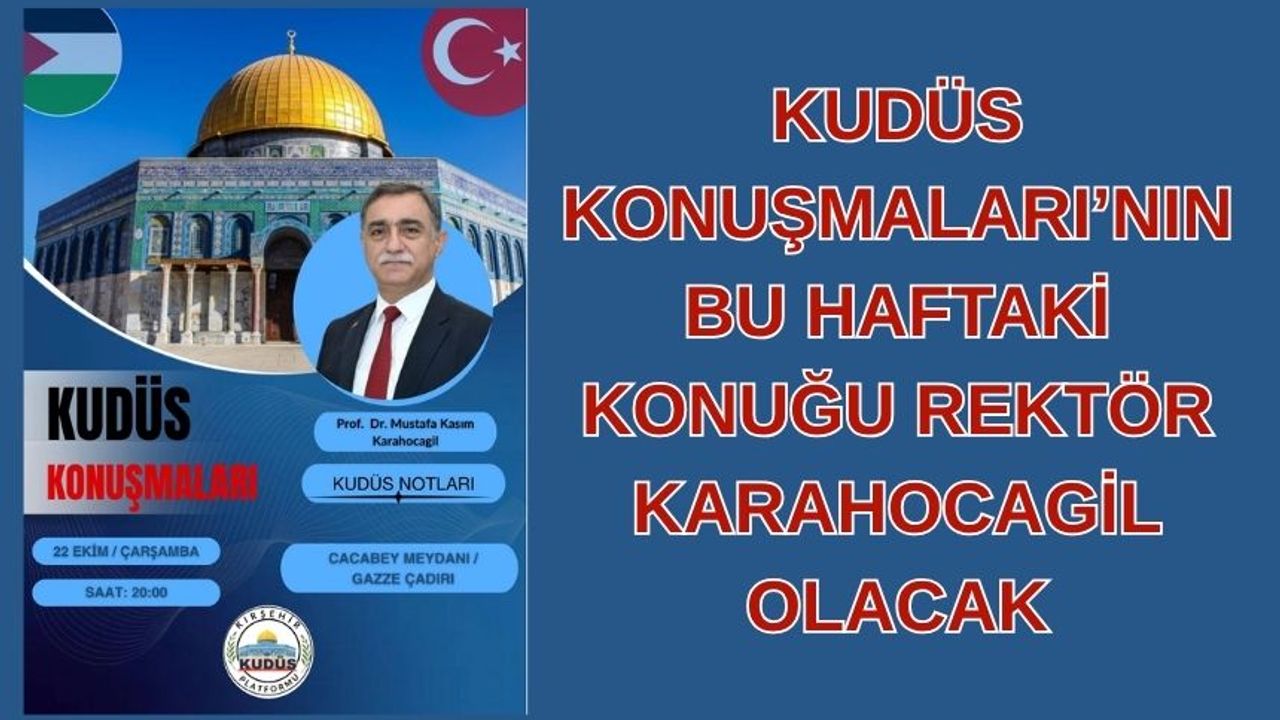 Kırşehir Kudüs Platformu tarafından Cacabey Meydanı’nda kurulan Gazze Çadırı’nda gerçekleştirilen “Kudüs Konuşmaları” etkinlikleri sürüyor. Kırşehir halkını Kudüs’ün manevi ve tarihi atmosferine götüren programın bu haftaki konuğu, Kırşehir Ahi Evran Üniversitesi Rektörü Prof. Dr. Mustafa Kasım Karahocagil olacak.