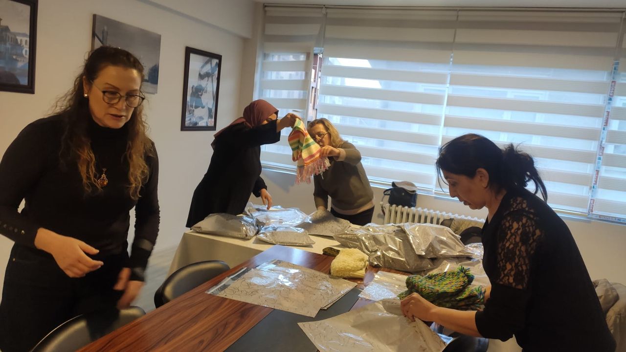 Kırşehir Kent Konseyi Kadın Meclisi öncülüğünde yürütülen proje kapsamında, öğrenciler için dokunan atkı, bere ve eldivenler Kent Konseyi binasına teslim ediliyor. Malzemeler, karne günü dağıtılmak üzere özenle tasnif edilip paketleniyor.